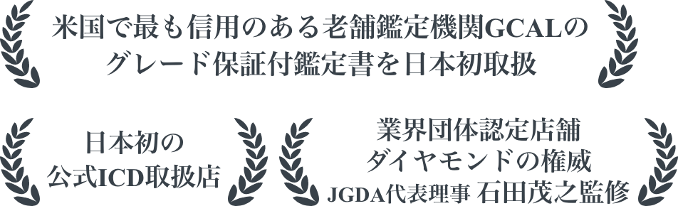 当店では、商品によって「GCAL:宝石鑑定保証研究所」「GIA : 米国宝石学会」「IGI:国際宝石学会」という世界3大鑑定機関のダイヤモンドから選ぶことができます。これは、どこの鑑定機関に出しても均一の評価を得る自信があるダイヤモンドを提供しているからです。