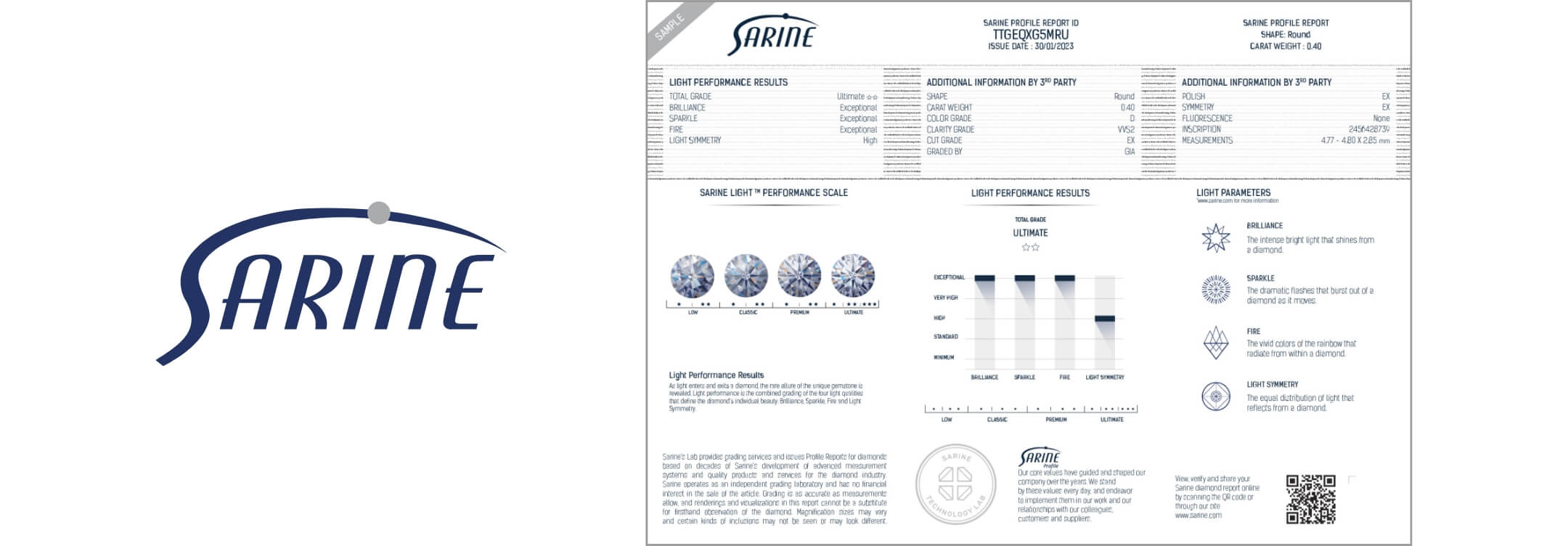 また、ICDカットグレード基準を満たしたダイヤモンドについては、Sarineのライトパフォーマンスの証明も鑑定書に含まれます。これは、ダイヤモンドの輝きや光の反射の品質を示すもので、美しさと品質のさらなる保証となります。